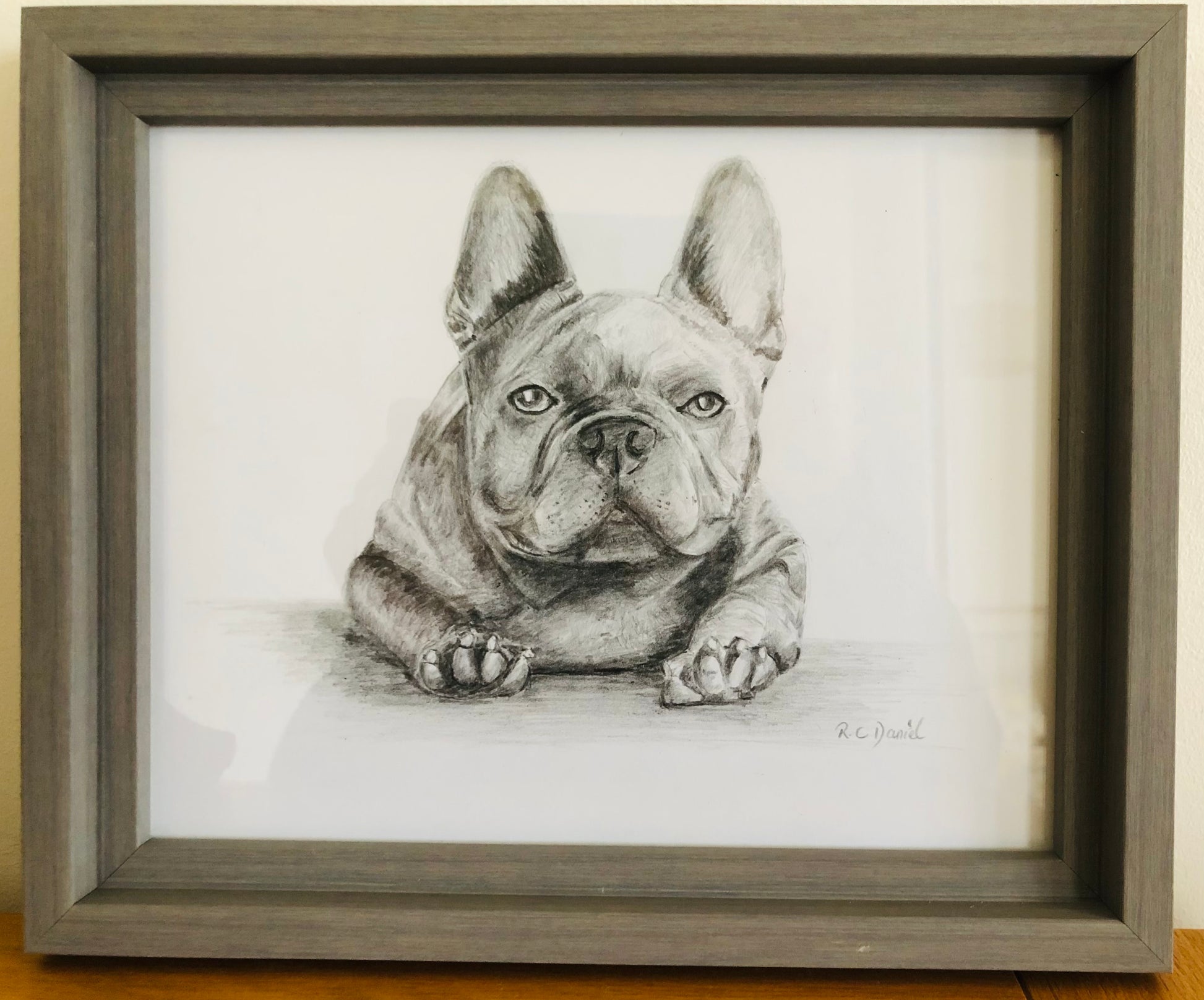 Framed pencil drawing of French bulldog